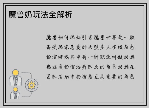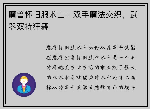 魔兽世界血条如何恢复原始装备技能 引言: 魔兽世界是一款备受玩家喜爱的大型多人在线角色扮演游戏。在游戏中,玩家可以通过击败怪物、完成任务等方式获得装备和技能。随着游戏版本的更新,有时候我们可能会意外失去一些原本拥有的装备技能。本文将详细介绍如何恢复魔兽世界中的原始装备技能,帮助玩家更好地享受游戏乐趣...